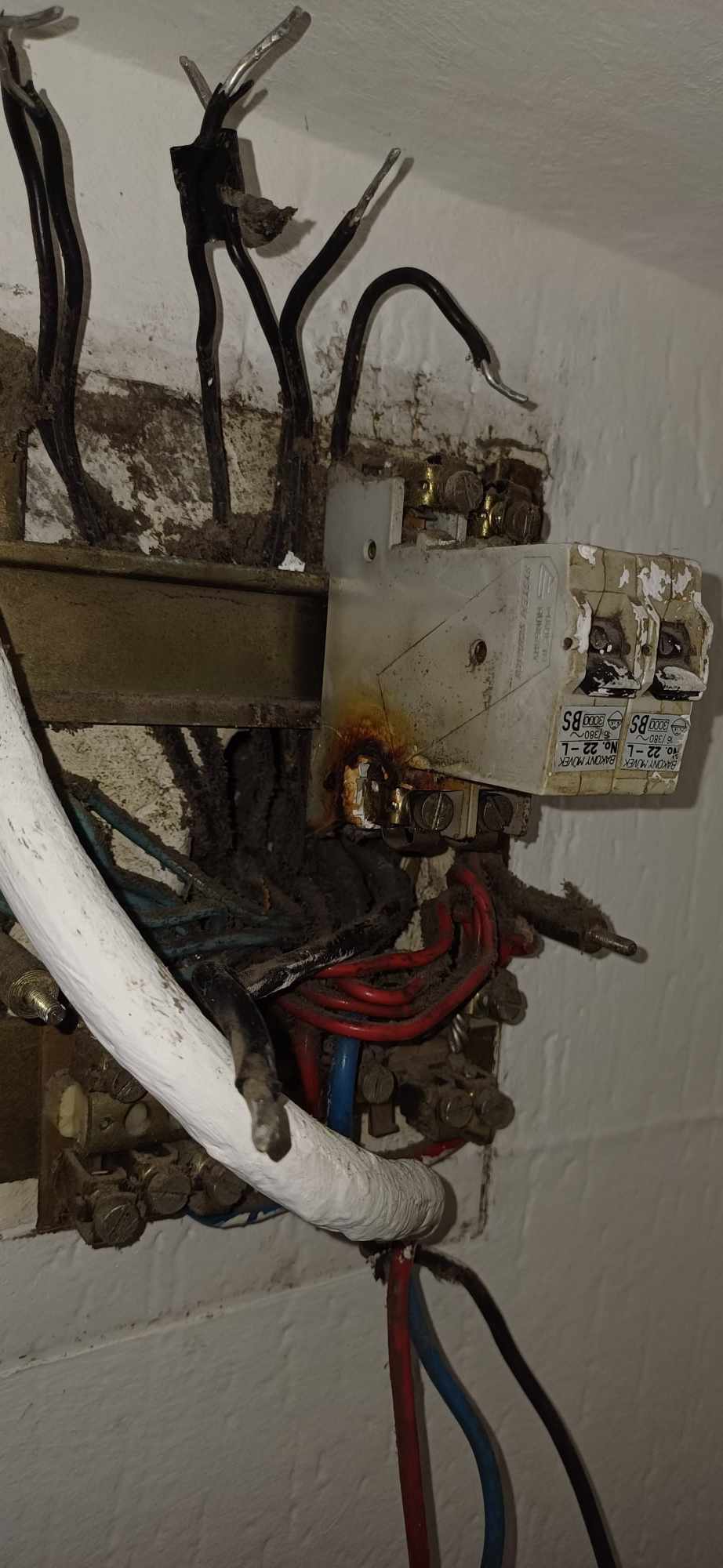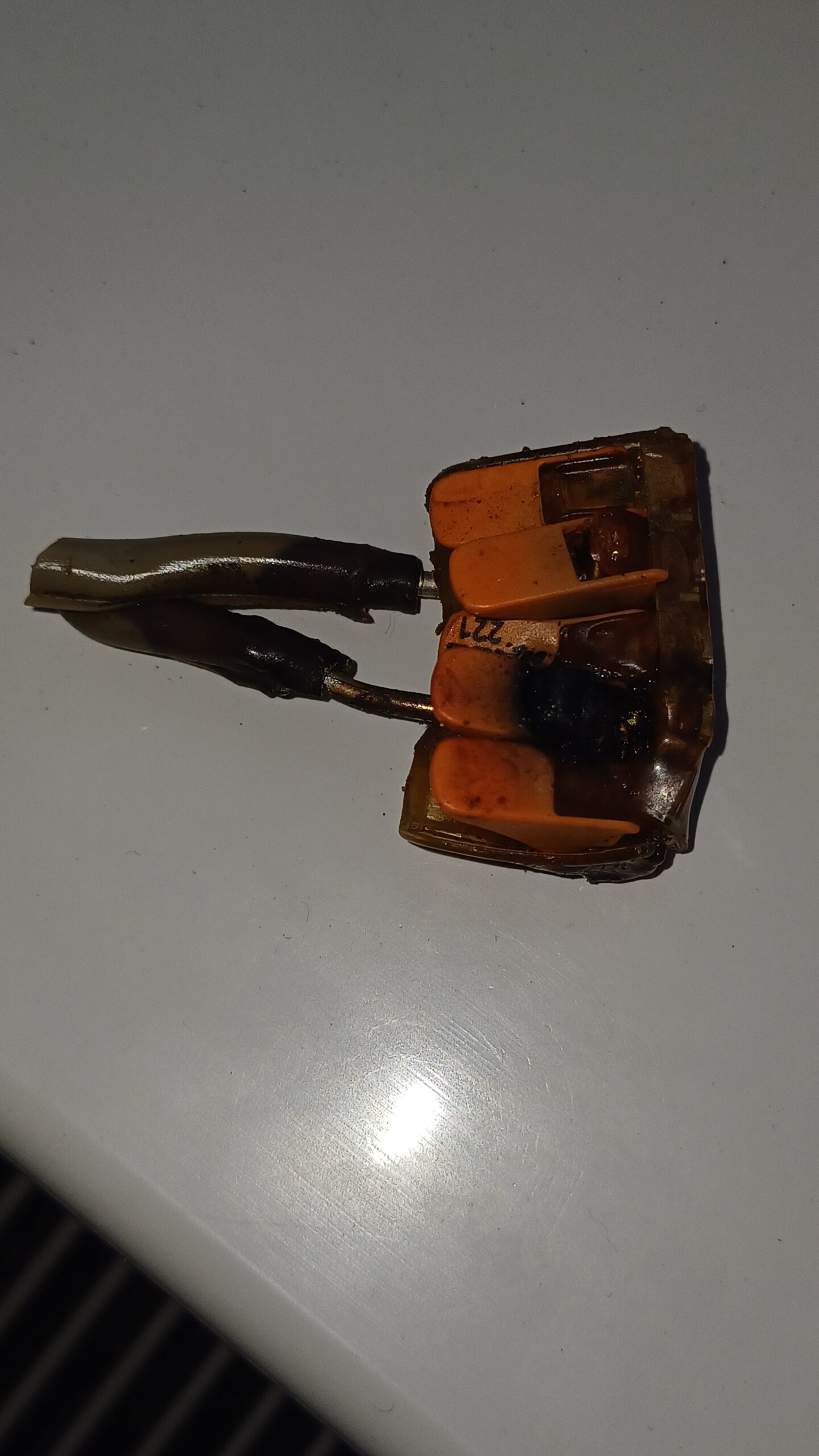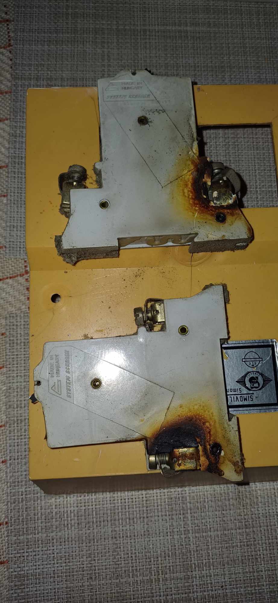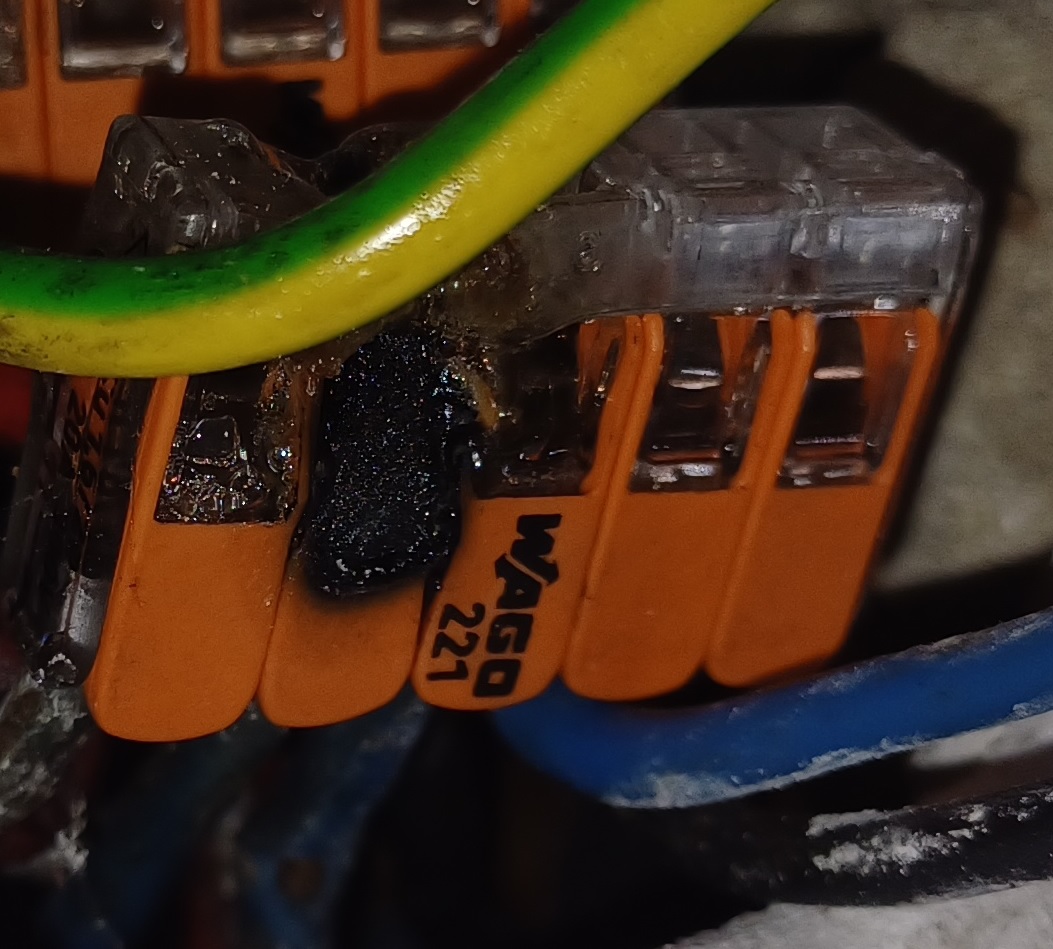 Megégett kötőelemek szétégett kötődobozokban, a helytelen kivitelezés miatt.